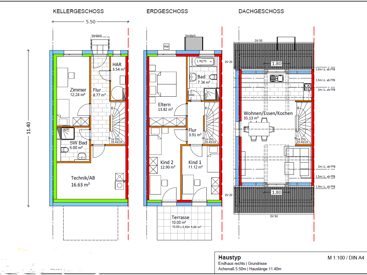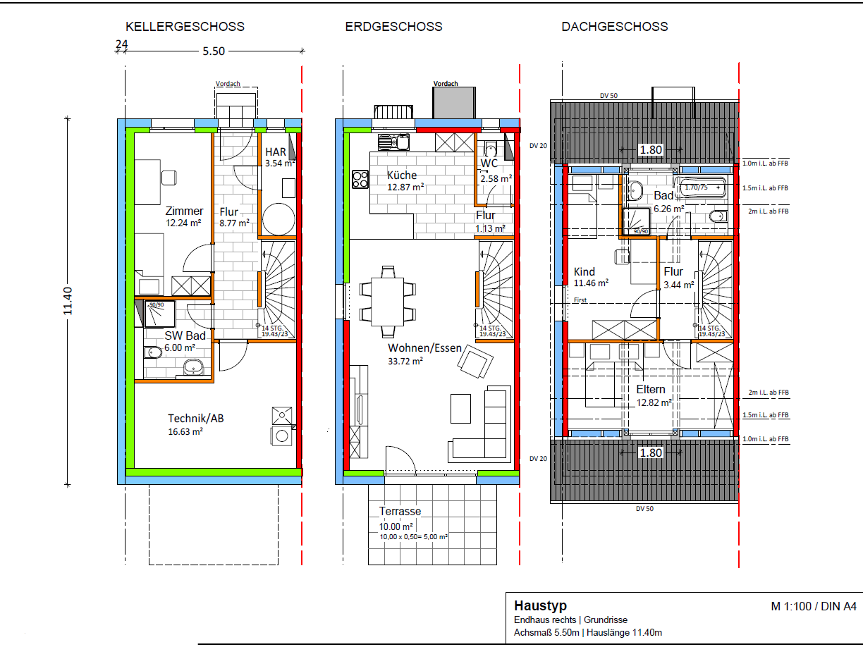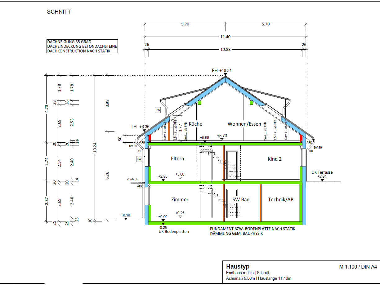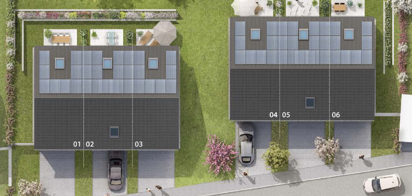 Reihenhaus mit 116 m² WFL + 20 m² NFL, schlüsselfertig. Endhaus mit 391 m² Grundstücksanteil, in KFW 40 und mit QNG-Zertifikat.